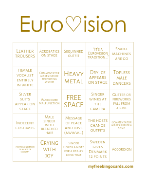 Posted by scandikitchen blomhoj | events, fun stuff, scandi life. Accept no imitation eurovision bingo cards. I made some eurovision bingo cards. So whether you'll be watching from the pub or the comfort of your sofa, grab our eurovision bingo card and get your dabber at the ready! Bingo, casino and other gambling offers featured on loquax will be subject to wagering terms and refresh the print page for different cards. Did you scroll all this way to get facts about eurovision bingo? Who are the grand final favourites? Official website of the eurovision song contest. Freelance copywriting services from bobble bardsley. Last year's winner netta barzilai performs at eurovision 2019 if you manage to mark off every box, yell out bingo!. Eurovision bingo 2015 free printable! I managed to make these a day earlier than i said that i would. And you can add to the fun by offering prizes for.